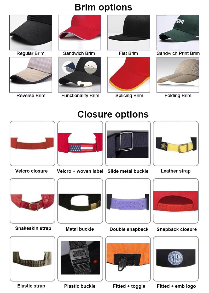The Brim and closure also can be custom made as per customer's design,below are some options for reference.